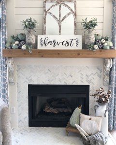 fall-fireplace-with-buffalo-check-and-sage-green-pumpkins-for-a-farmhouse-look.-Shiplap-and-herringbone-tile-on-the-fireplace-