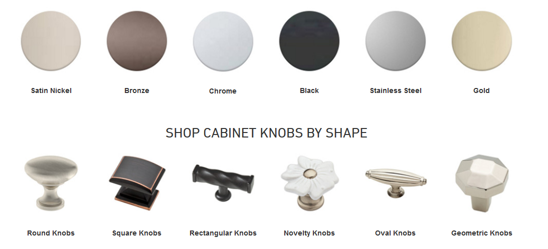 Knobs are also available in the same variations of square and round. Below are options provided by Home Depot.