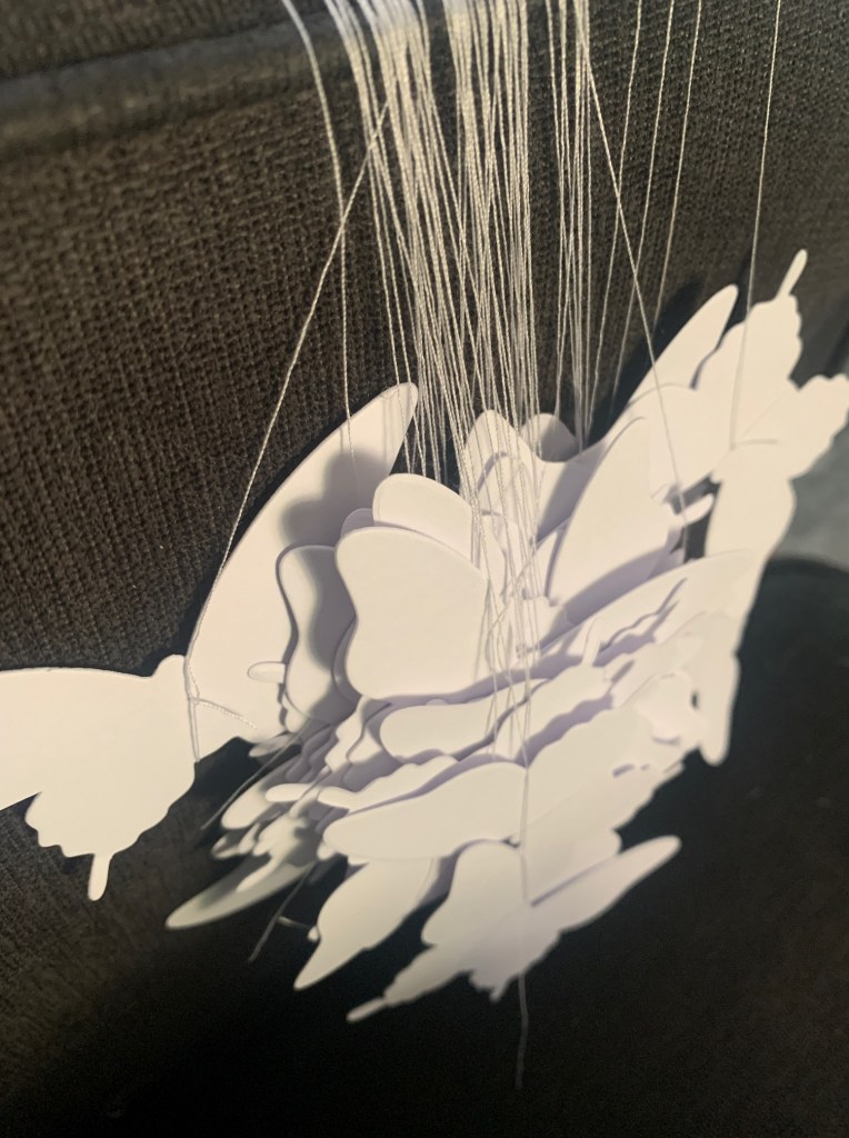 The butterflies are paper cut outs meant to be stuck on the wall but instead I hung them with white string as you can see below. Then all I did to mount them was use clear thumbtacks. Now this may not be the preference for everyone however it was “mom approved” and rental friendly. I probably hung anywhere from 60-70 butterflies in the room. I staggered them in height, folded and hung them in varying direction. This gave them a more realistic look. I will say my thumbs were very sore from the thumbtacks.