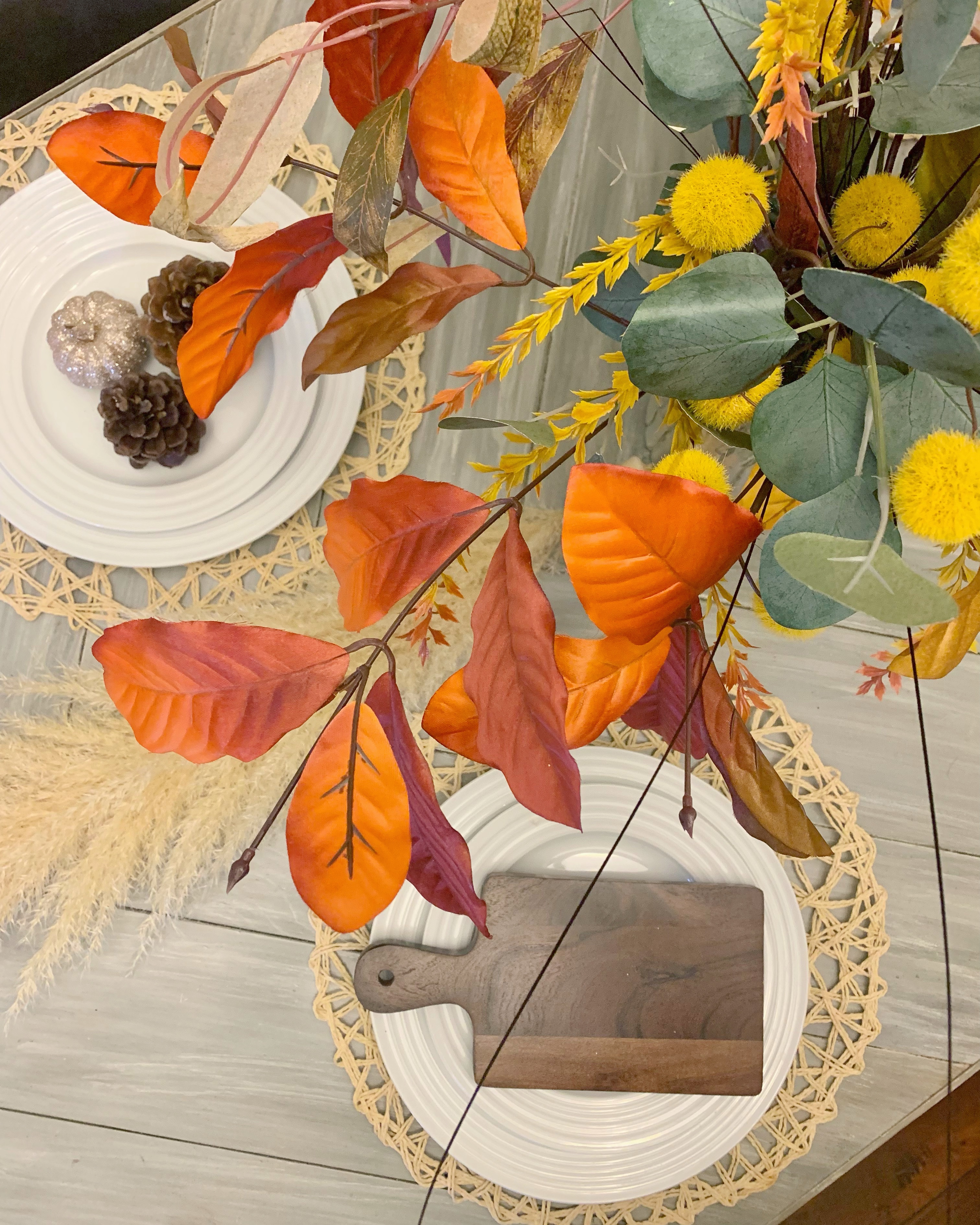 Do you enjoy the change of color that the Fall season brings? Then add a pop of color to your table by mixing stems and florals! Add all of the layers! This can be done with real or faux stems. I have accumulated these stems over the years from the following stores: Michaels, Target, Hobby Lobby and the 99cent store. Never be afraid to mix greenary with brown colors. They contrast well and the gold and orange here just shine. The place mats are more Earthy and natural in feeling which pair nicely with the table setting. This mini charcuterie board I purchased at Target and can be used a variety of ways during the season.