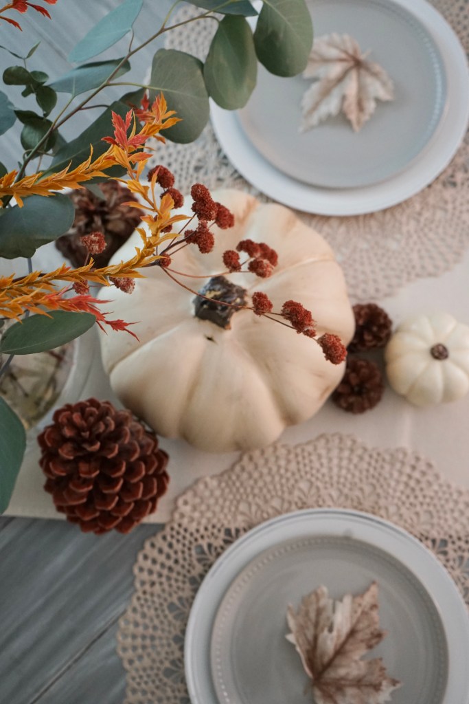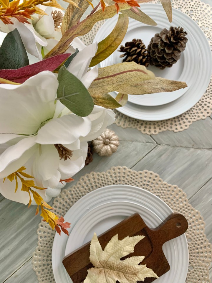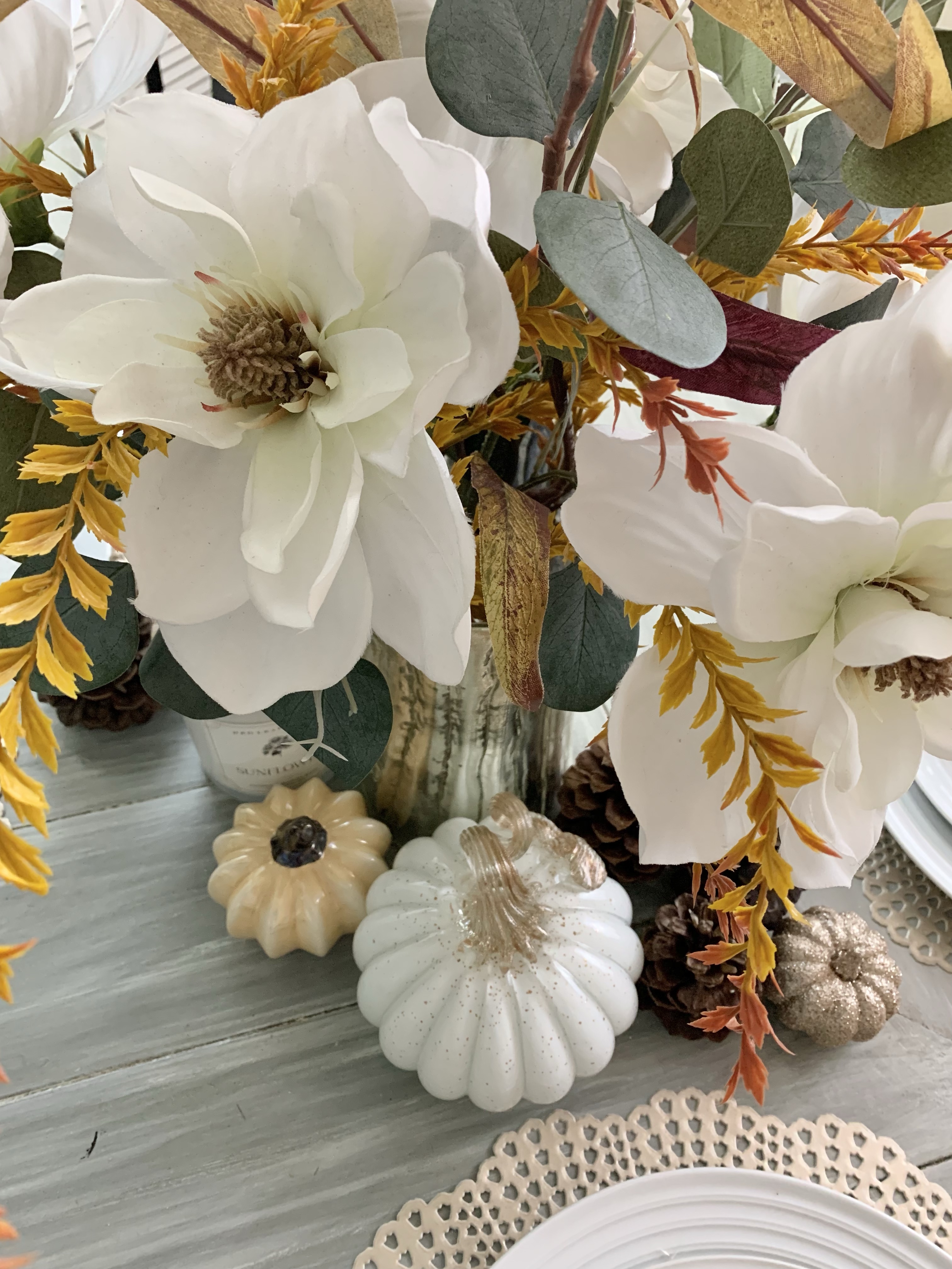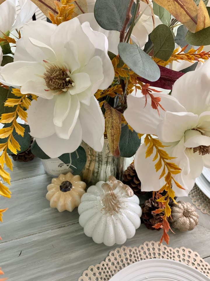 A contemporary mix for this tablescape. Literally placed all my items on the table and mixed them up to compliment one another. What I love about this centerpiece is I have mixed summer/spring white floral with brown Fall stems. I bet you may have never thought about that. Its ok to mix seasons up. This is even better if you are afraid of too much color you can toss in a neutral base to break it up a bit. The plates also compliment the white so it does not stand alone. I added some pumpkins to this tablescape and you can add your decor pieces or some live mini pumpkins as well for the season!