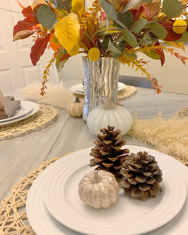 Now this tablescape is from last year but I still love it very much. What makes this one a little different? Well you will see the table runner which helps define the table space. But want to know my favorite thing? It’s the plastic plates!! Yes I said it! The white plates are plastic! Easy clean up my friends! No you don’t need fine China for the holidays and you can find beautiful plastic plates every where this time of year. This includes your grocery store, Marshalls and TJ Maxx. The second favorite thing to this tablescape is that I actually mixed real and faux stems. I bet you can’t even tell! And I picked up all the real stems on my walk in the neighborhood.