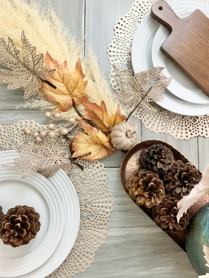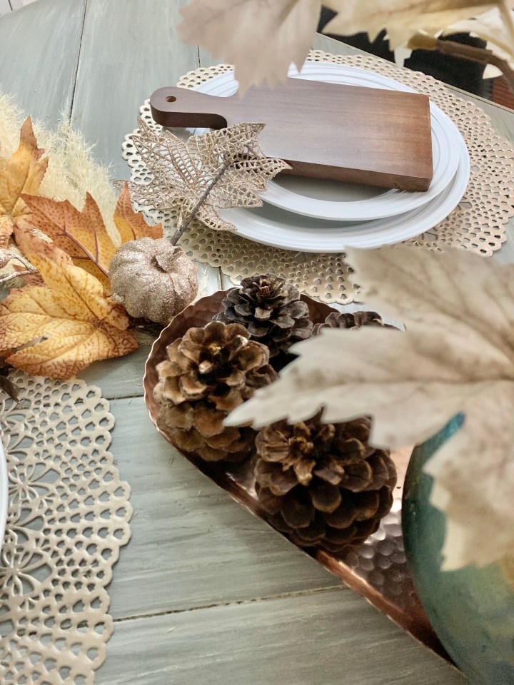 I was able to collaborate with a fellow friend, decorator and YouTuber “JustBeingKatherine” for some Fall tablescape ideas. If you don’t follow her on youtube or Instagram you need to as she continues to inspire and share easy DIYs, home decor, and encouraging messages on her channel. Katherine does it all and her apartment home is filled with such great detail, creativity and beauty you will want to go take a peak! We came together to inspire you with some awesome ideas! We each chose an item to include in our tablescape so you will see the pine cone and mini charcuterie board in all of the designs. I’m going to share Katherine’s holiday tablescape design and video later in this blog.